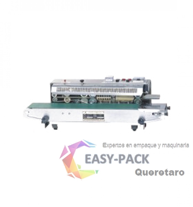 Selladora de banda continua horizontal inversa de mesa con impresion en tinta.