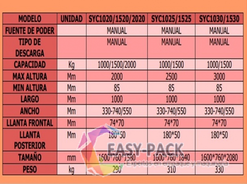 Capacidad 1000/1500/2000 kg, Max altura 2000 mm, Min altura 85 mm, Largo 1000 mm, Ancho 330-740/550 mm, Llanta frontal 74*70 mm, Llanta posterior 180*50 mm, Tamaño 1600*760*1580 mm, Peso 290 kg.