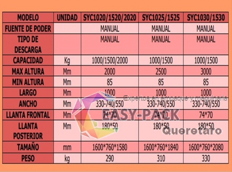 Capacidad 1000/1500/2000 kg, Max altura 2000 mm, Min altura 85 mm, Largo 1000 mm, Ancho 330-740/550 mm, Llanta frontal 74*70 mm, Llanta posterior 180*50 mm, Tamaño 1600*760*1580 mm, Peso 290 kg.