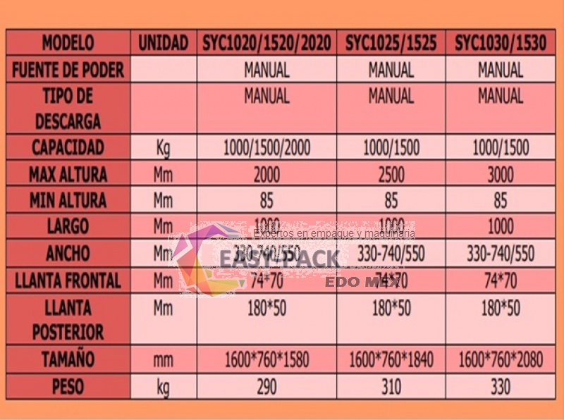 Capacidad 1000/1500/2000 kg, Max altura 2000 mm, Min altura 85 mm, Largo 1000 mm, Ancho 330-740/550 mm, Llanta frontal 74*70 mm, Llanta posterior 180*50 mm, Tamaño 1600*760*1580 mm, Peso 290 kg.